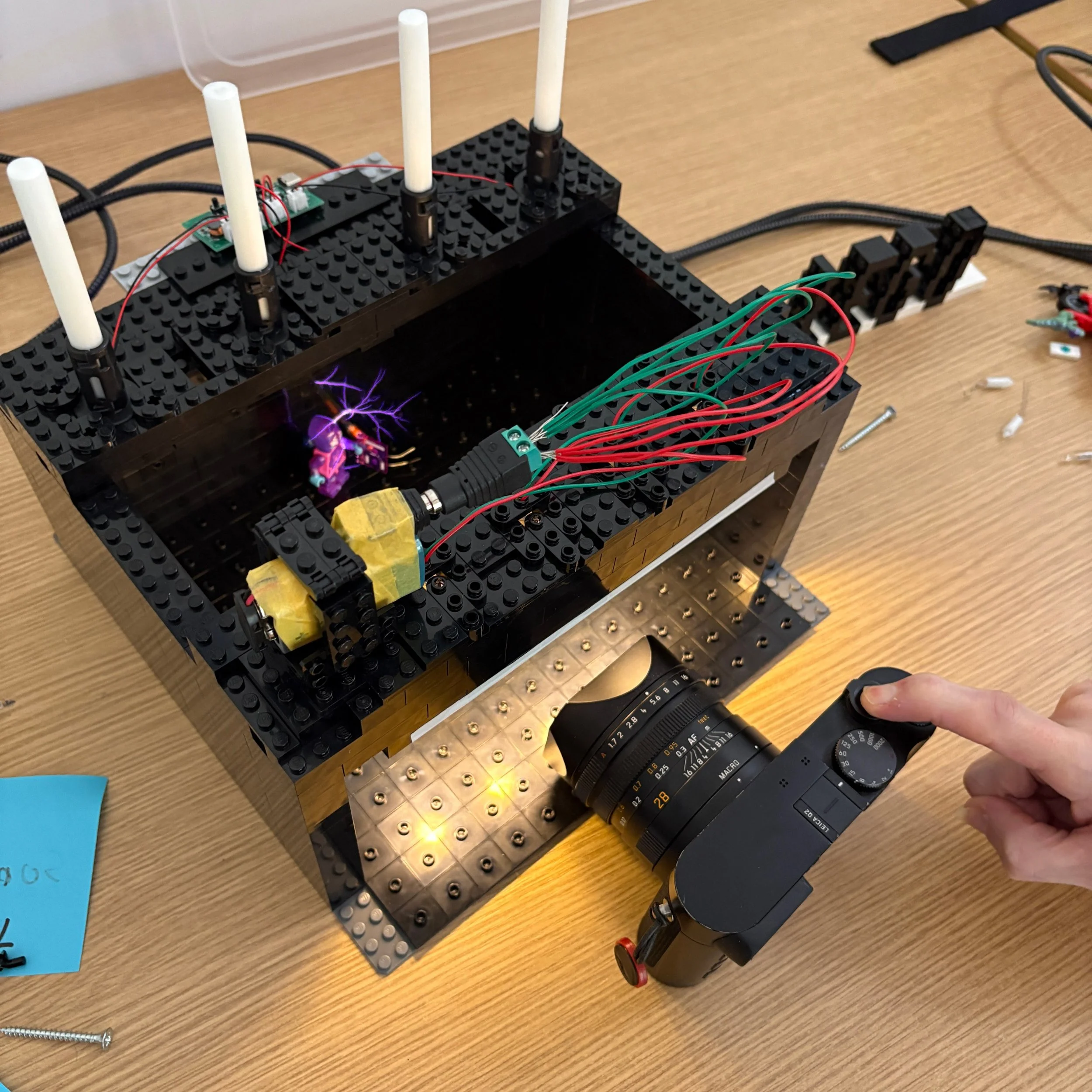 The Lego stage. The stage lights are working pretty well to add some illumination from the front. The white towers are humidifier sticks. These are USB powered but fussy about how much power so unfortunately they weren’t working today.